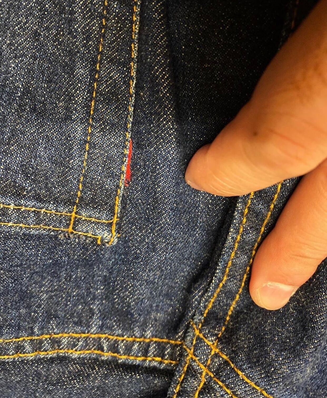トップボタン裏2。ツーウォッシュ程度?くらいの濃紺です。サイズもゴールデンかなと思います。タブ無し、スモールボタン横に1箇所切れがありますが、簡単なリペアでお直し可能かと思います。このサイズの、この色はなかなか見つからないかなと思います。