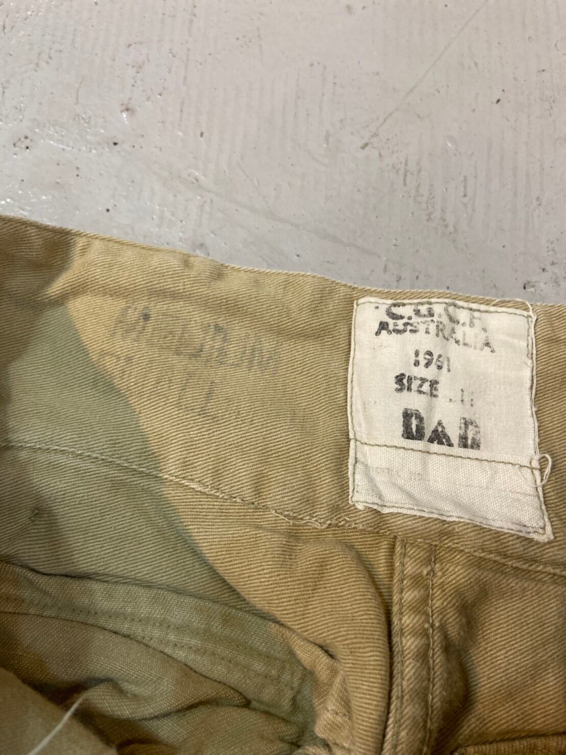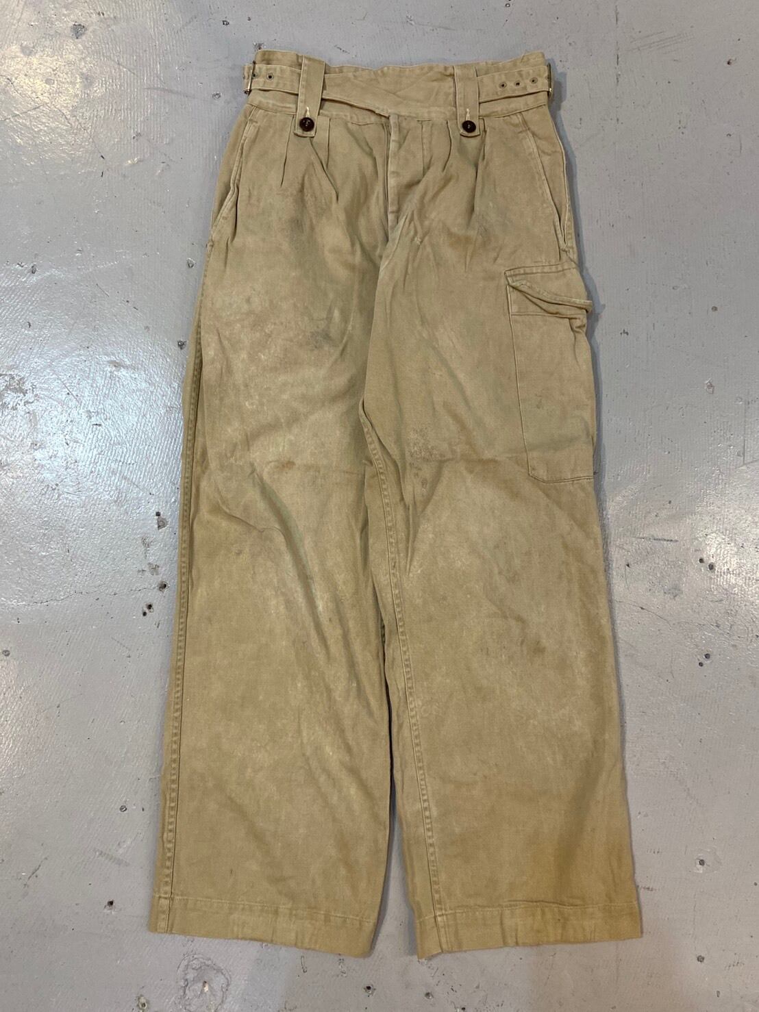 多少の使用感はありますが、着用に問題のある様なダメージなとばないかなと思います。履いていただけるとシルエットの良さも感じていただけるかなと思います。イギリス領時代にオーストラリアに支給された物になりますが、パンツ自体はイギリス軍の物と同じ物になります。