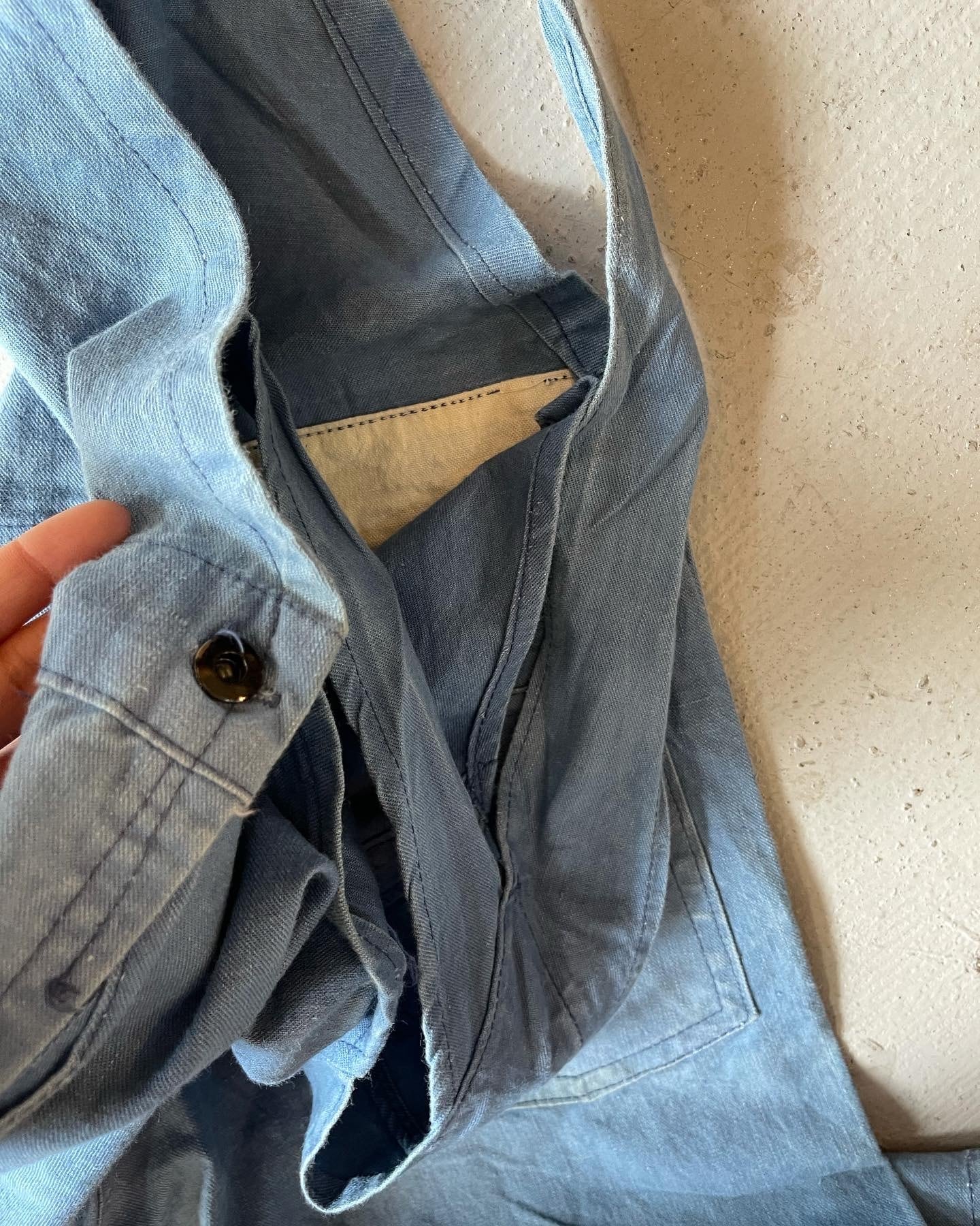 1910年頃のローバックスタイルオーバーオールになります。黒ラッカーのドーナツボタンにこの簡素な作りもたまりません。サイズ感としては、小柄な男性や女性が着られるのも良いかなと思います。