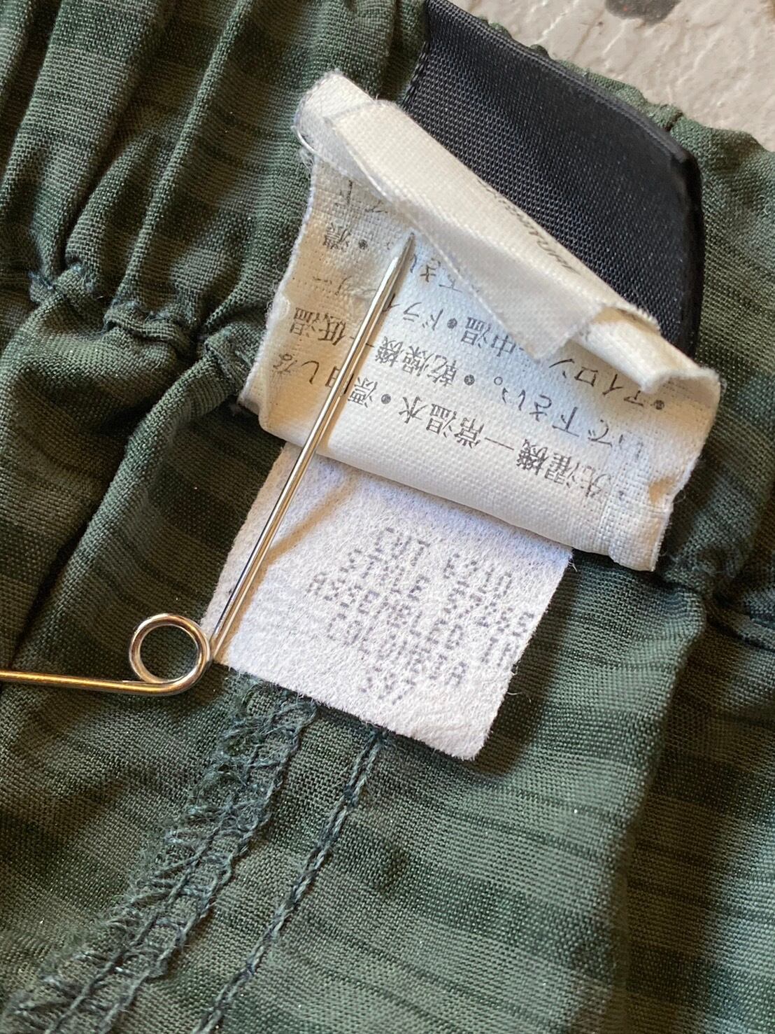 グリーンツートンのストライプで、タグがバックポケットに付くシンプルなパターンです。