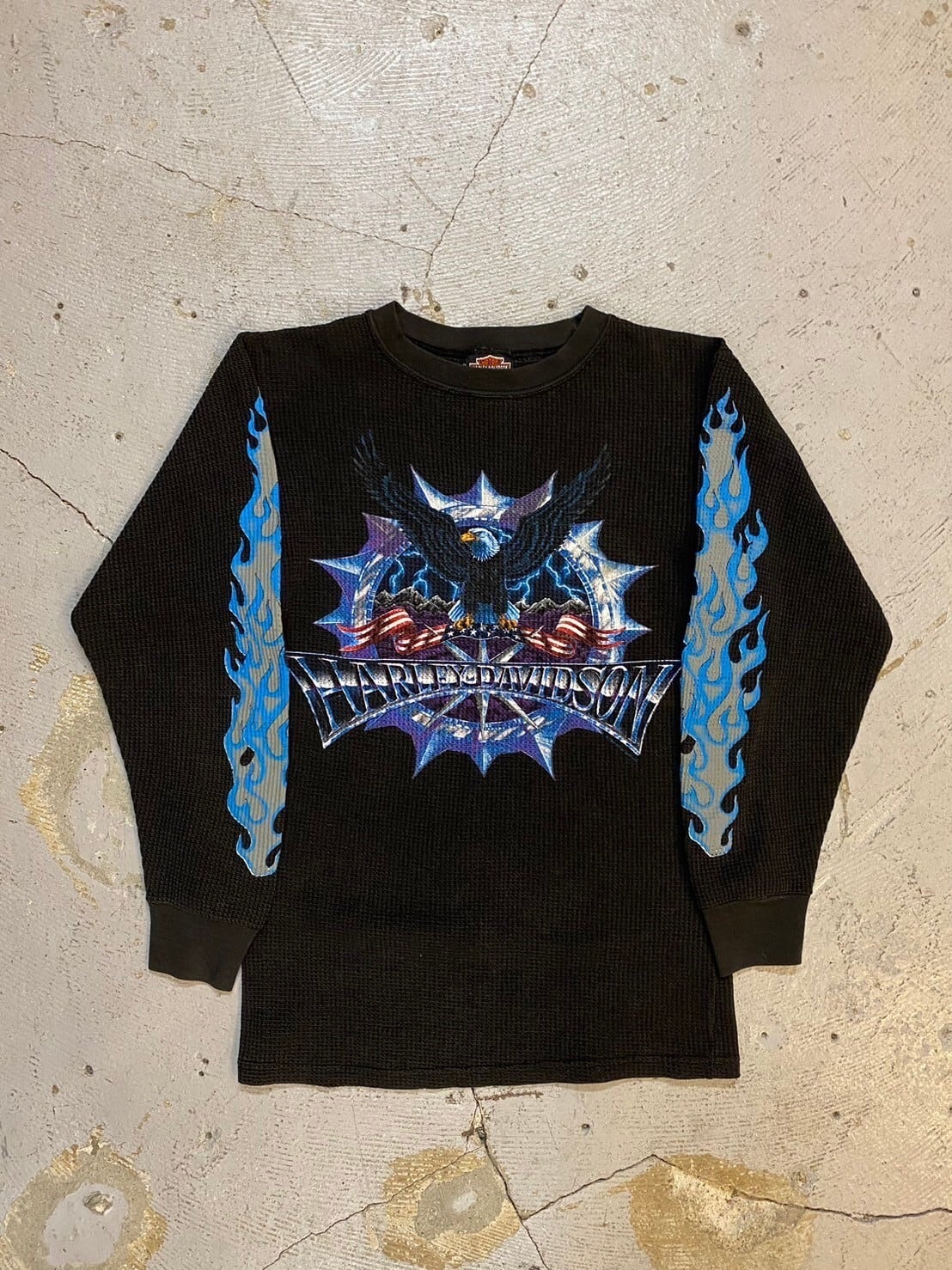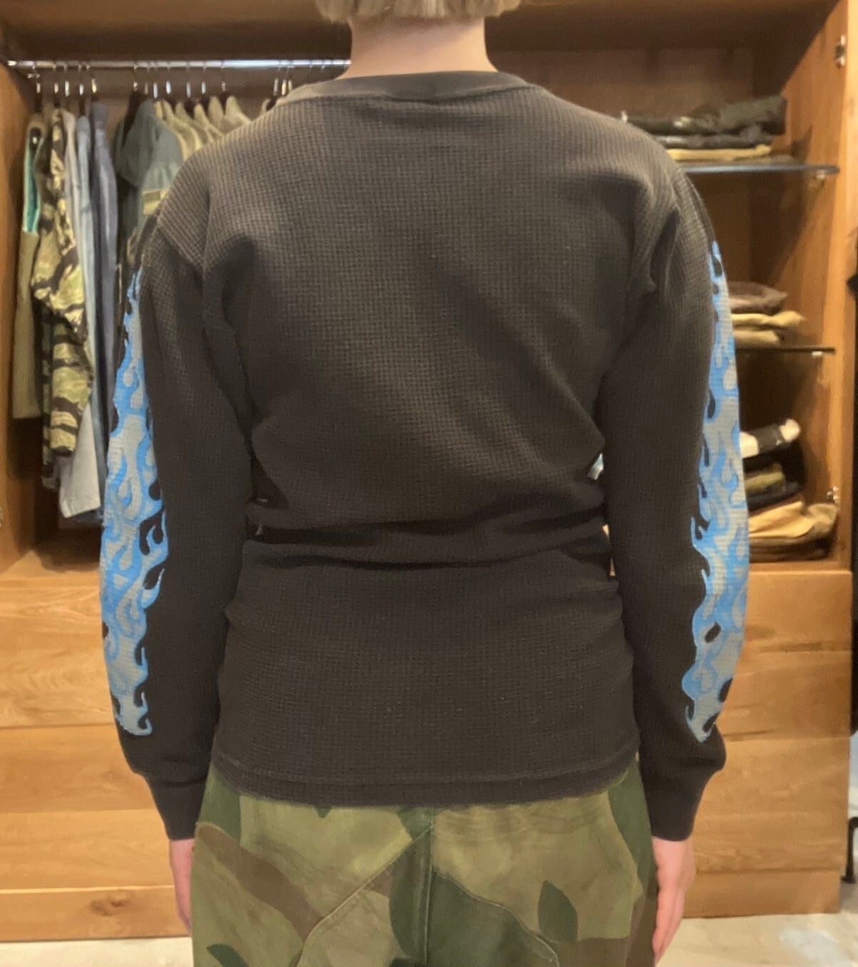 フェードしたボディに、存在感のあるプリントが、フロントに加えて両袖にもフレイムパターンで入ります。